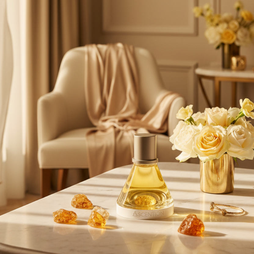 Ascent to Courage is crafted using a blend of premium aroma molecules and natural botanicals chosen for depth, performance, and emotional resonance. Sacred woods, resins, and soft citrus are composed through cruelty-free, biodegradable ingredients that preserve richness without environmental strain.